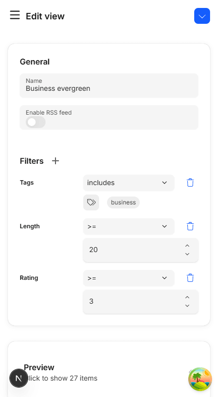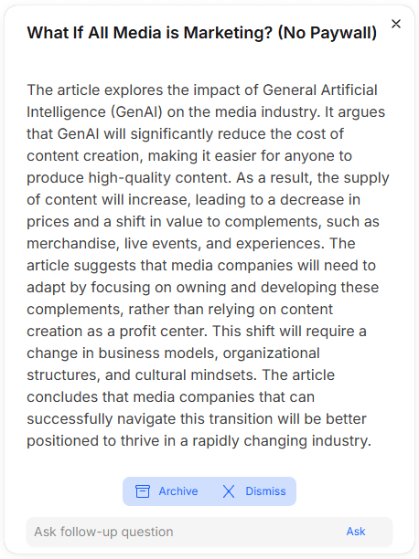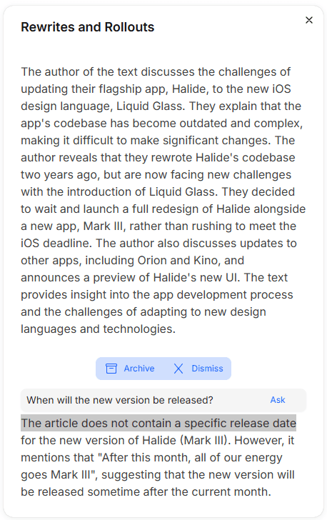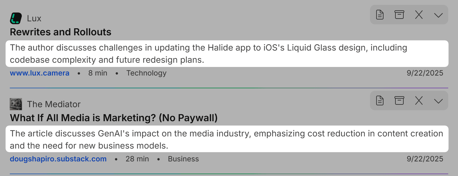 Content is automatically summarized into a few sentences. Perfect when getting the gist is enough.