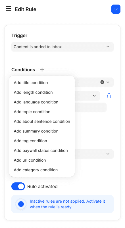 Filters for selecting specific content to display in the inbox, for processing a subset of content.